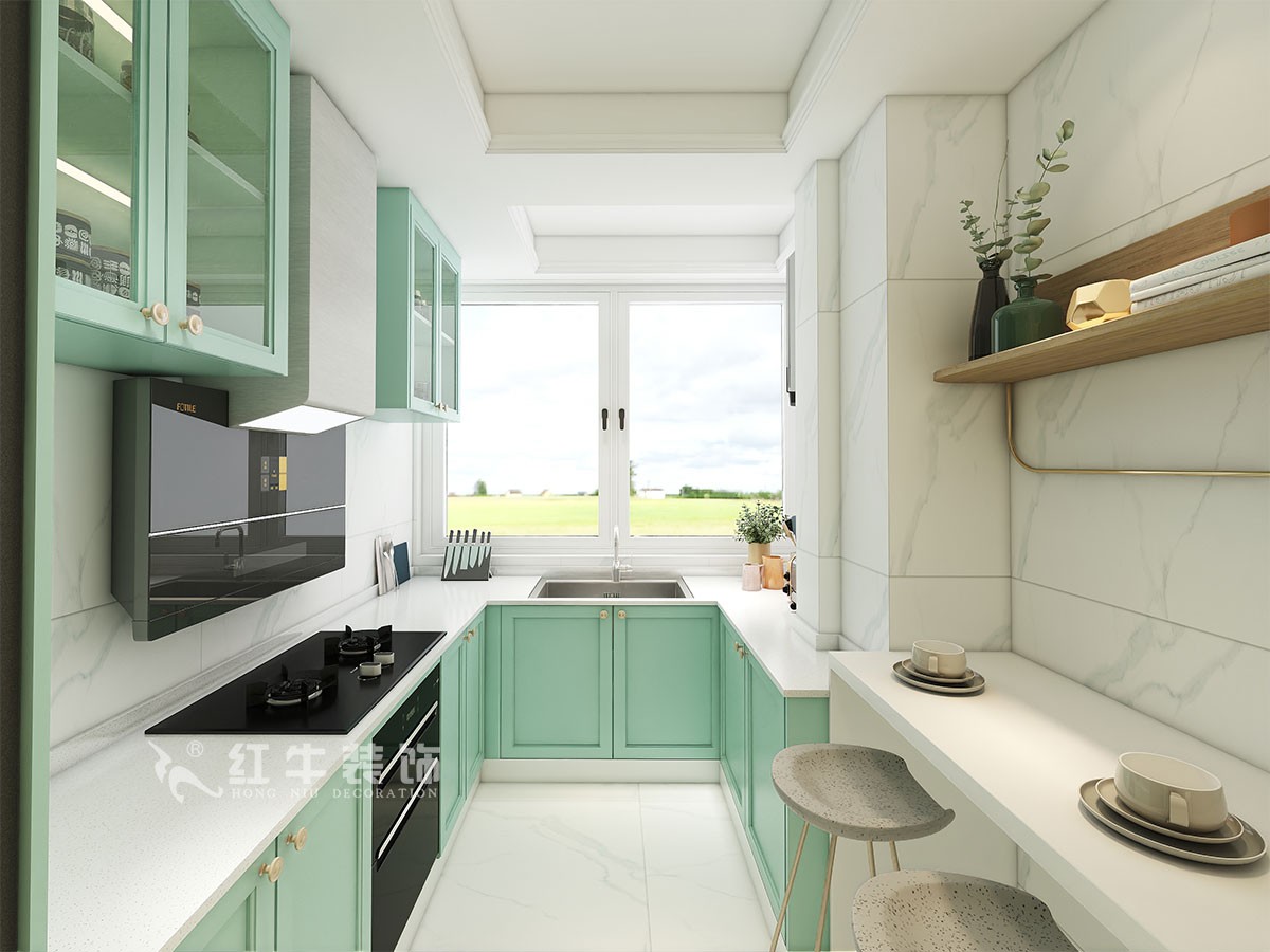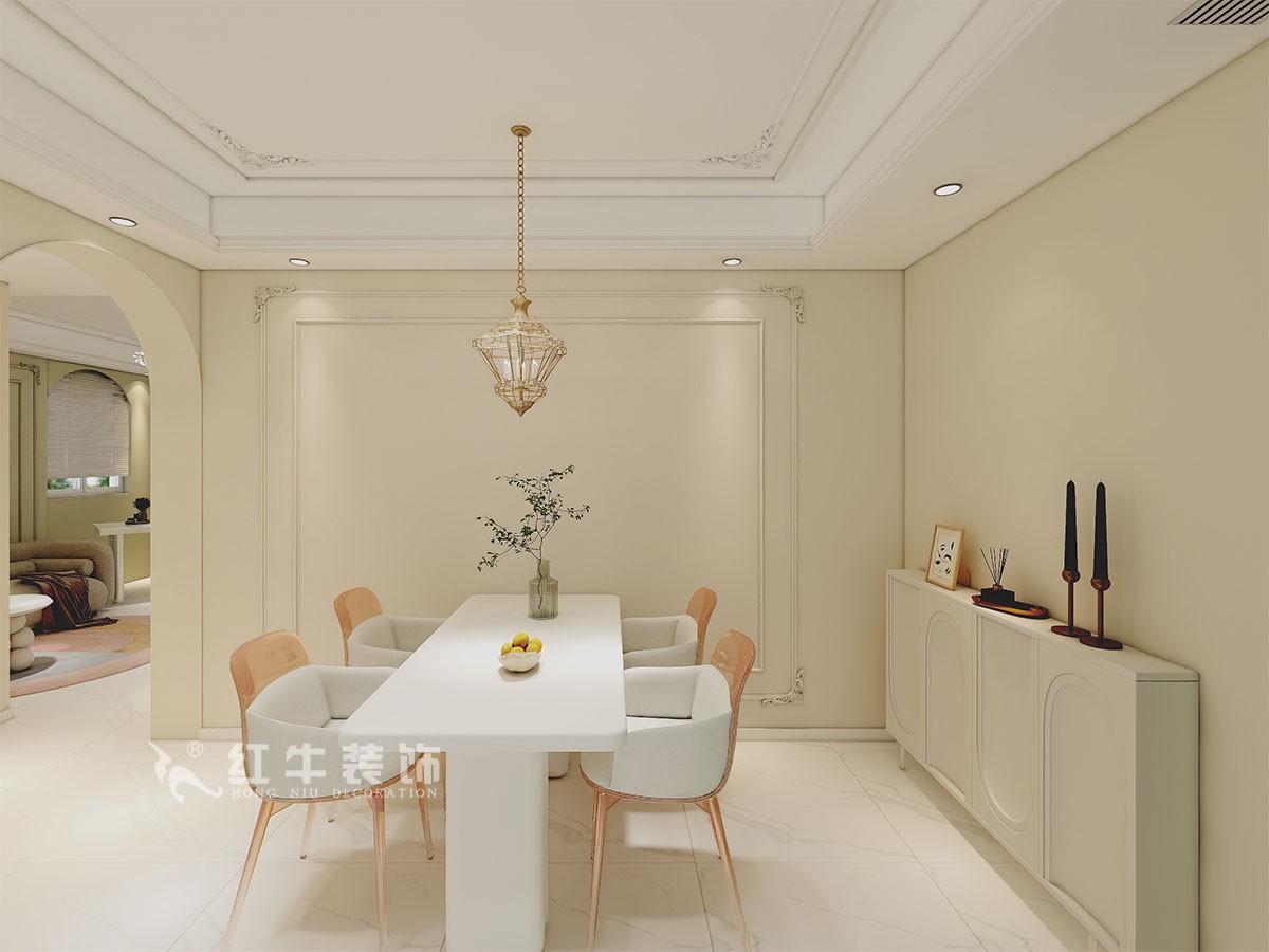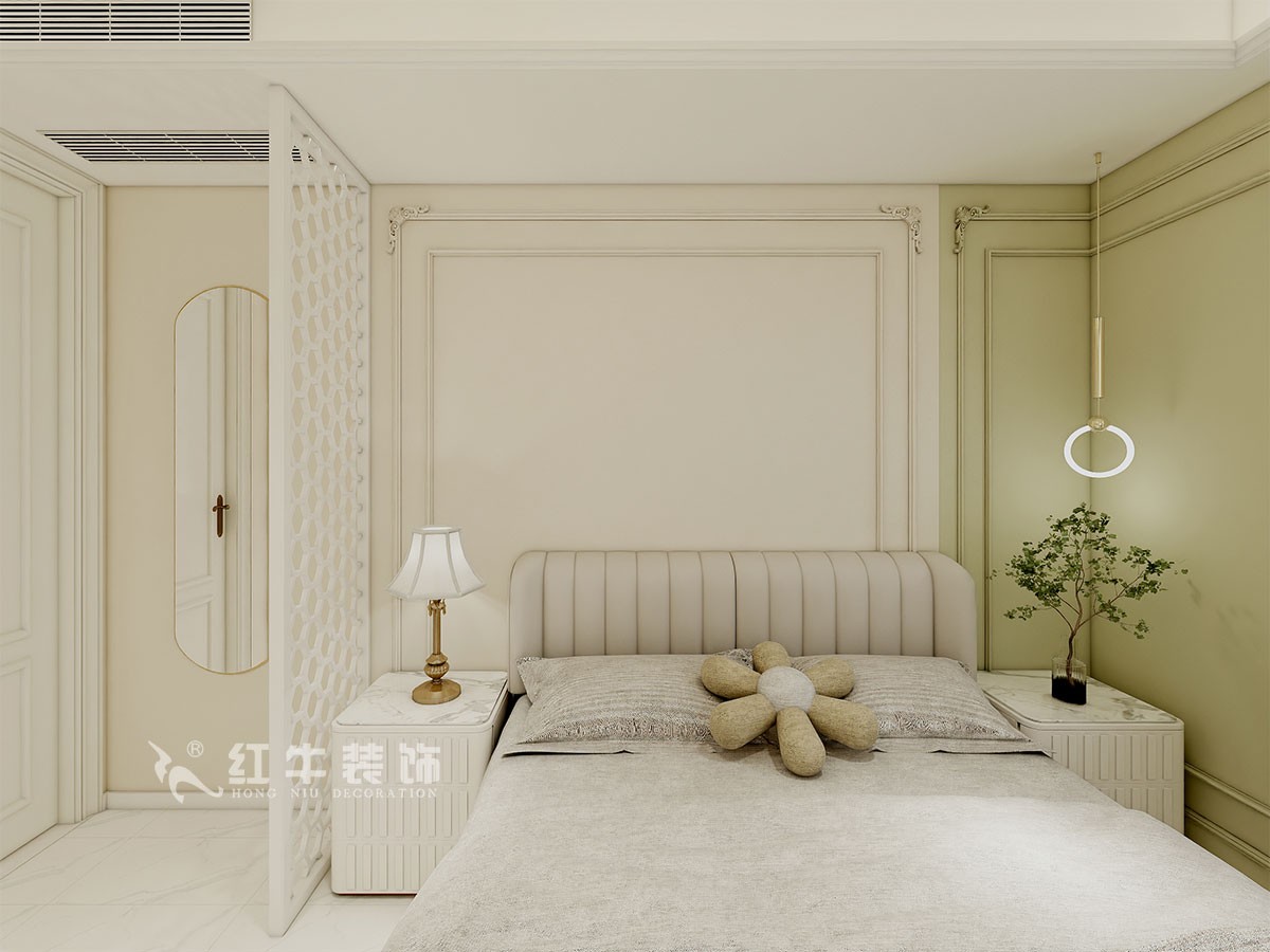 本案是本案客戶女兒回國臨時居住,以法式奶油風定義,網紅牛油果綠加上汝窯色,調節出歡快溫馨的效果,頂墻面線條增加立體層次感,設計上背景采用牛油果綠加上暖色的搭配,使空間看起來溫馨自然,利用原結構的特點制作出三個圓弧,交相呼應。