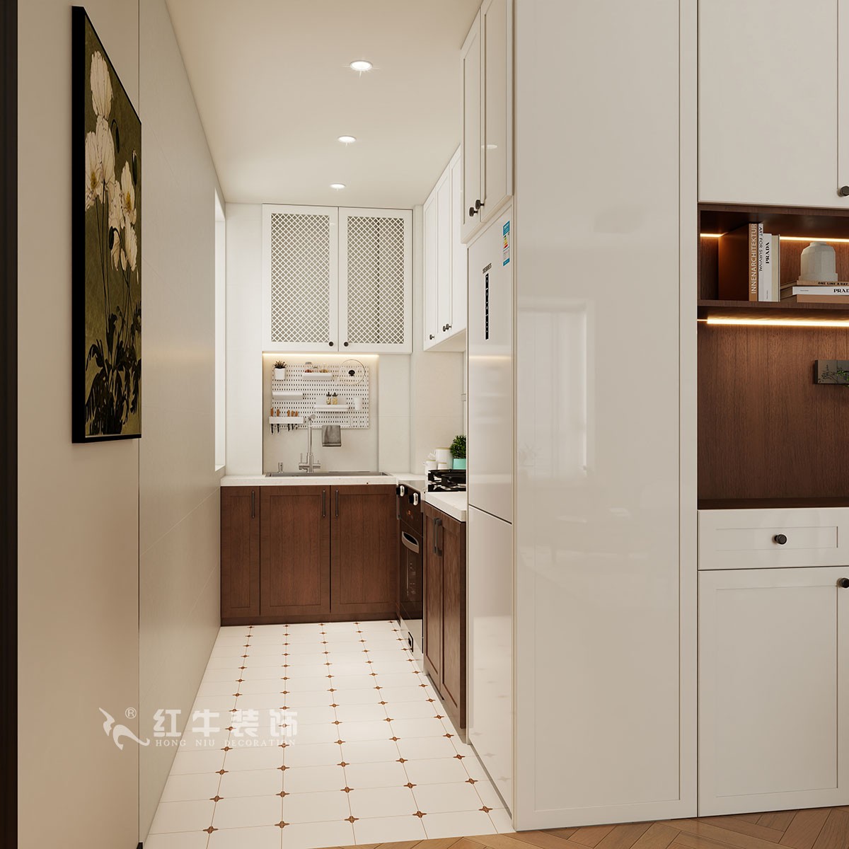 房子比較規(guī)整,廚房比較小,主要考慮冰箱的位置,正好利用餐邊柜設(shè)計和冰箱鏈接一起,空間更加整體。