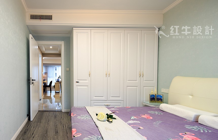 淡青色的墻壁,搭配白色的柜子給人一種清新舒適的視覺(jué)感。床的外觀簡(jiǎn)單大方,邊邊角角沒(méi)有鋒利的棱角,使得臥室顯得溫暖而又柔軟。