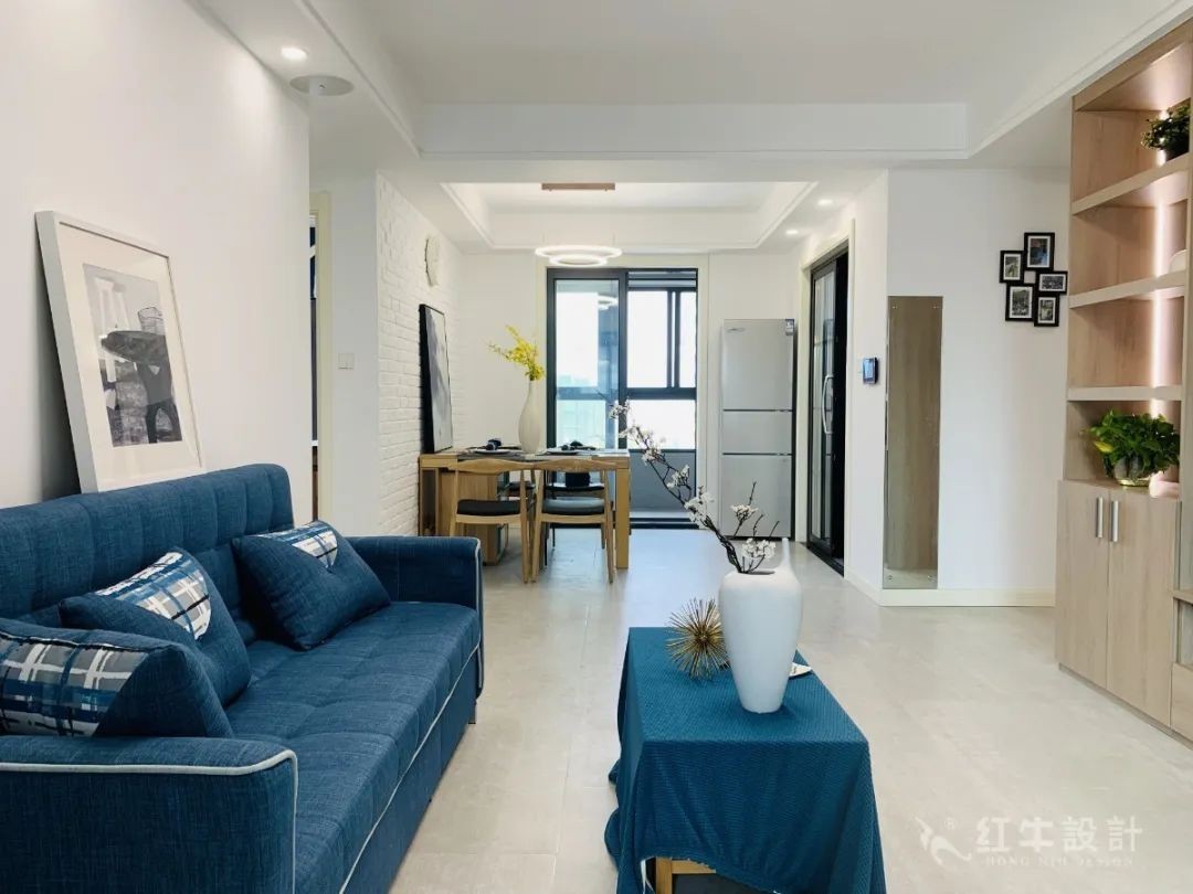 深藍(lán)色的布藝沙發(fā)特別吸晴,豐富了整個(gè)空間的配色。