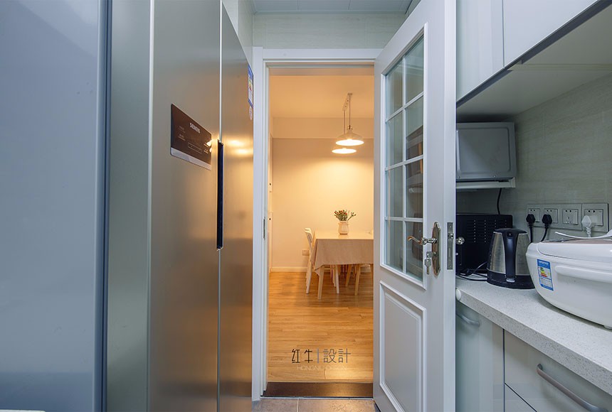 2.由于廚房的開間比較小,只夠做一個L型的柜子,再加上要放雙門冰箱,廚柜操作臺面特別小,所以把衛生間和廚房的中間墻體拆掉,縮小的衛生間的開間,擴大了廚房的空間,增出了很多臺面。